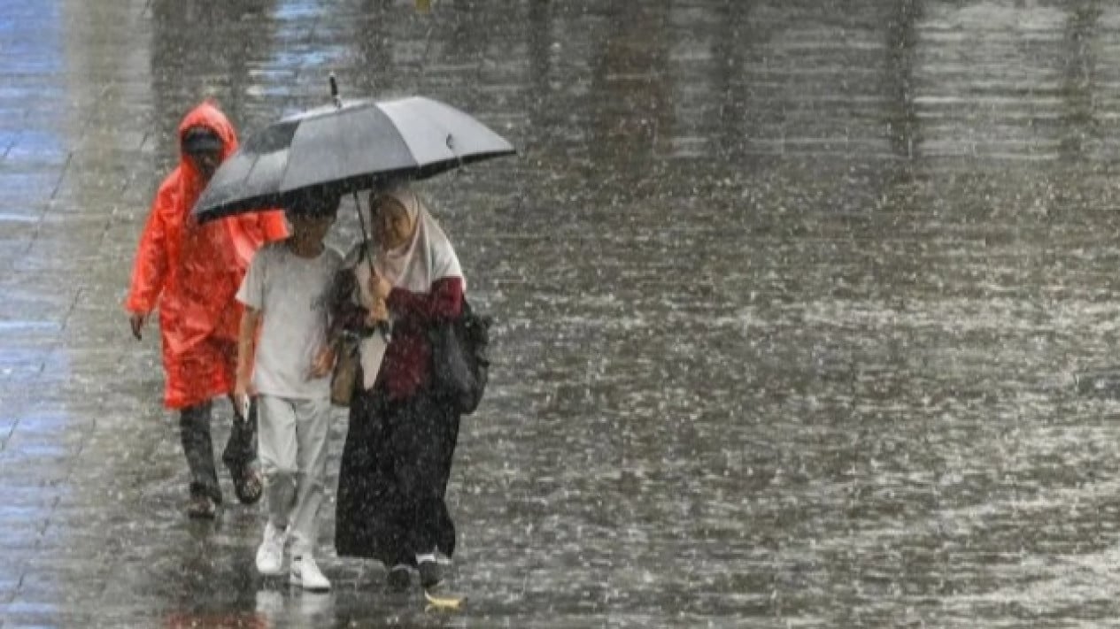 Terlihat beberapa masyarakat menggunakan payung dan jas hujan
