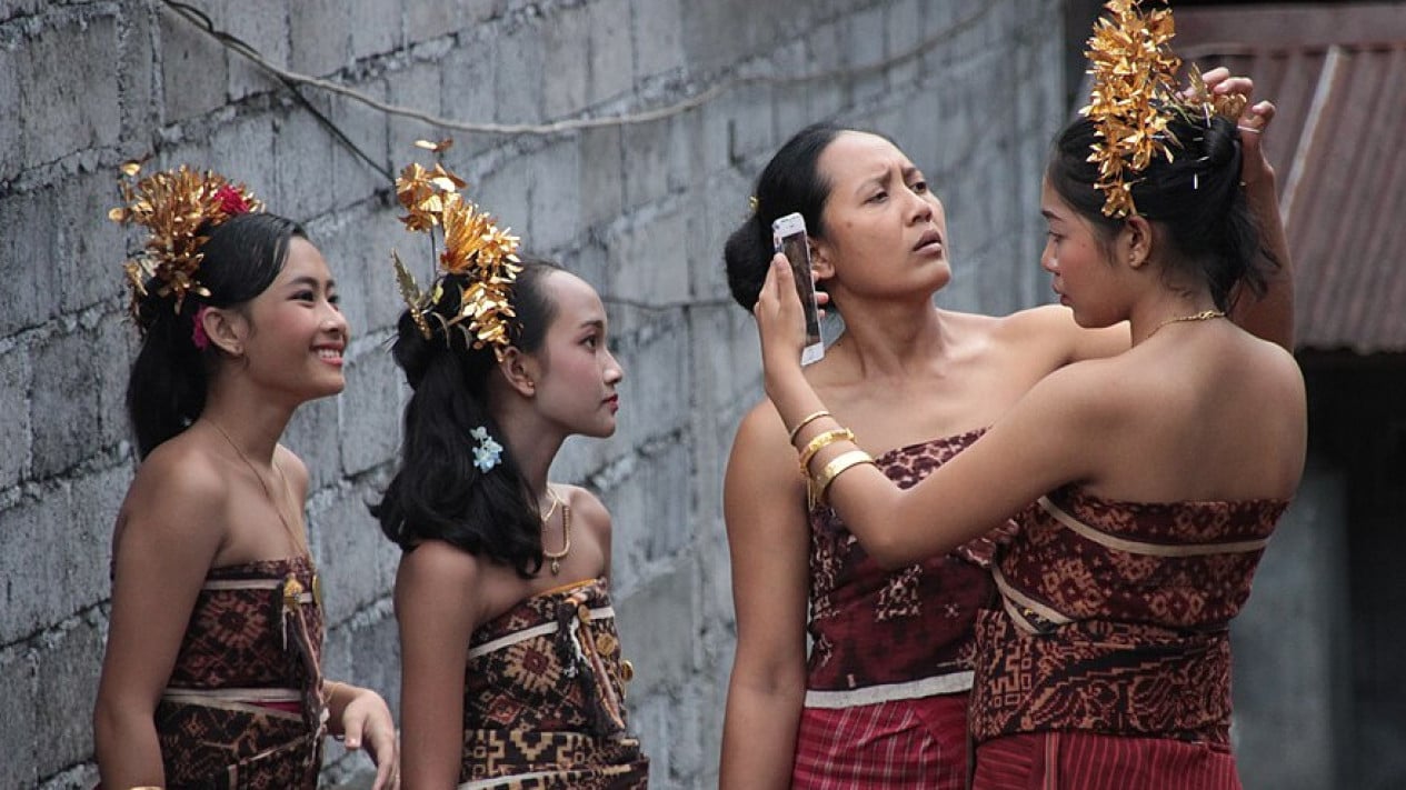 Ilustrasi pemakaian kain tenun gringsing, busana adat Bali.